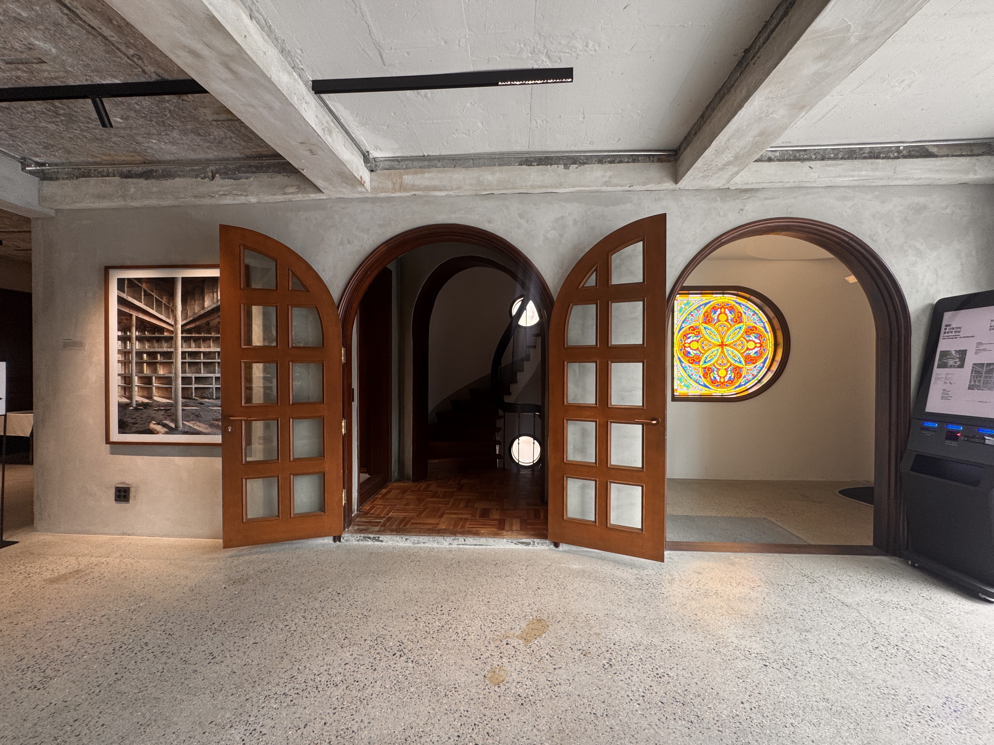 연희정음에 도착해 마주한 아치 도어와 스테인드글라스로 전시를 시작해봅니다.